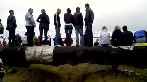 Люди стоят и сидят на трубах. После окончания МАКС автобусы заезжают на территорию, автомобили выезжают с автостоянки "Быково"