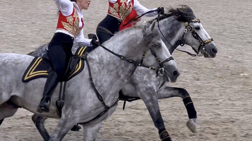 Как справится молодой жеребец Тулипо с волнением? Номер "Фламенко": четыре андалузских лошади Идальго и танцовщица.