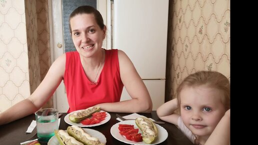 Вкусный мукбанг//Готовили вместе с Соней//Лодочки из Кабачков с чесночным соусом//Спелые помидоры.