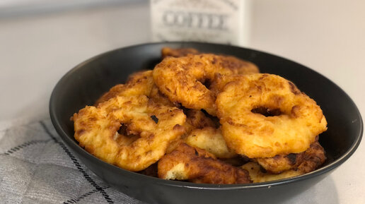Картофельные кольца с чесноком. Готовятся в кипящем масле, получаются хрустящими-хрустящими. Смели со стола за пять минут,а это значит, рецепт удался.