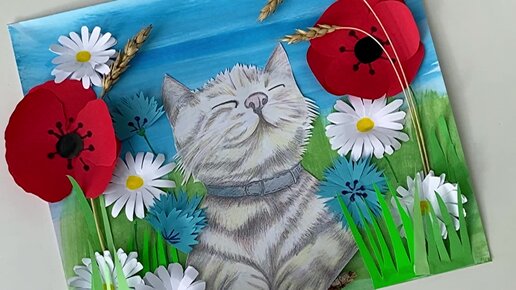 Котик мурлыка (шаблон моим подписчикам в подарок) с летней аппликацией для совместного творчества с детьми с полянки, где васильки, ромашки