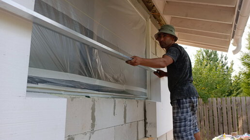 Приклейка первых листов пенополистирола на фасады дома, корректировка под провесочные шнурки и трехметровое правило. СФТК Мокрый Фасад