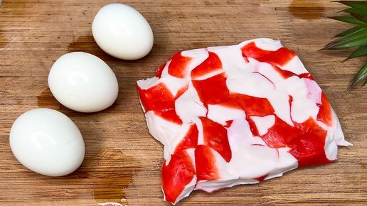 У меня всегда есть в запасе упаковка крабового мяса для этого салата: готовится на скорую руку и на столе долго не задерживается