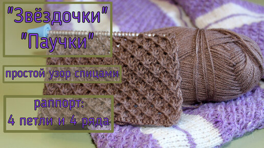 "Звёздочки" или "Паучки". Простой узор спицами. Раппорт: 4 петли и 4 ряда