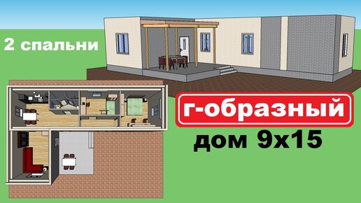 Г-образный дом 9 на 15. Проект одноэтажного дома 9х15м. 2 спальни, терраса. План дома, интерьер.