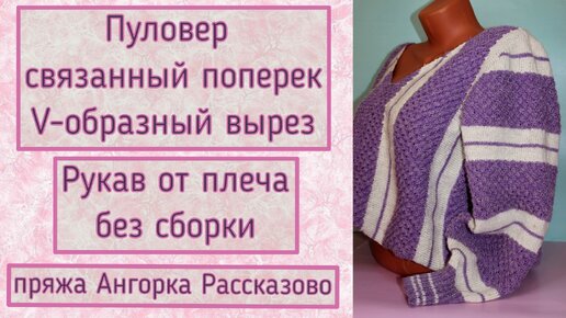 Вяжем рукав от плеча без сборки. Пуловер связанный поперек с V-образным вырезом горловины. Пряжа Ангорка Рассказово