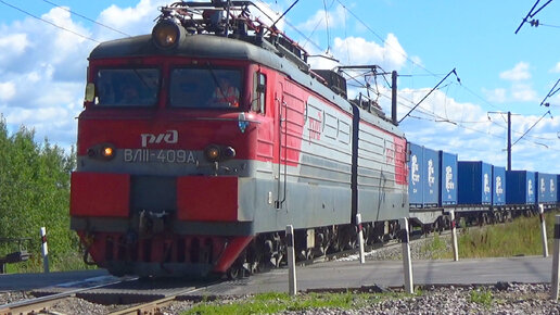 Электровоз ВЛ11-409 с контейнерным грузовым поездом, платформа Новопетровская
