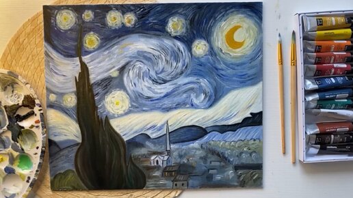 Мастер-класс картина "Звёздная ночь" художника Винсента Ван Гога🌙 материалы: гуашь, акрил, масляные краски