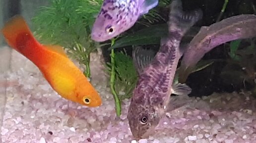 Рыбки компаньоны. Коридорас и пецилии объединились в поисках еды