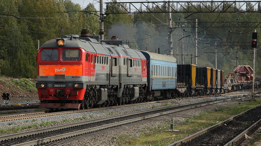 Хозяйственный поезд под тепловозом 2М62У-0137 встречается с грузовым поездом под электровозом 3ЭС4К-009. Станция Большой Двор Октябрьской жд