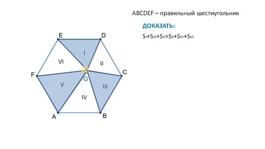 Правильный шестиугольник. Доказать, что сумма площадей синих треугольников равна сумме площадей белых треугольников. Разбор.
