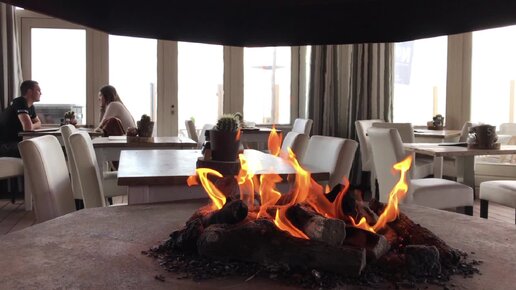 4К. ОТКРЫТЫЙ КАМИН В СЕРЕДИНЕ ЗАЛА. У ОКНА МОЛОДАЯ ПАРА БЕСЕДУЯ НАСЛАЖДАЮТСЯ ЗВУКАМИ ОГНЯ.