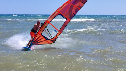 Крым. Отдых 2022. Приморский. База виндсерфинга Wild Beach. Август. Ветер Северо-восточный. Женька делает разворот у берега.