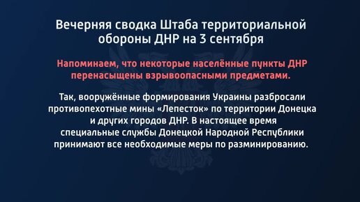 Вечерняя сводка штаба территориальной обороны ДНР на 03 сентября 2022 года