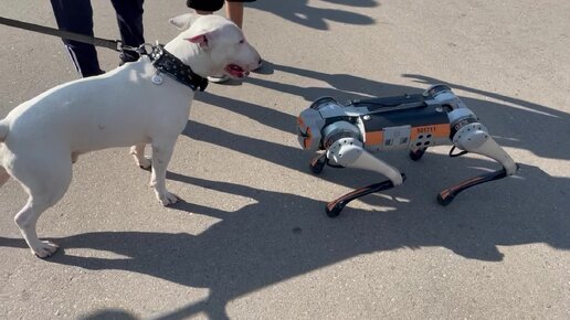 Теперь люди покупают роботов-собак вместо животных. Робот и бультерьер на прогулке