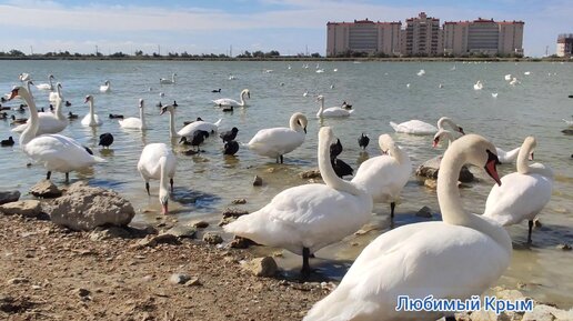 Лебединое озеро, Сасык-Сиваш, одна из достопримечательностей Евпатории. Лебеди выходят на берег и берут корм из рук. Крым, сентябрь 2022