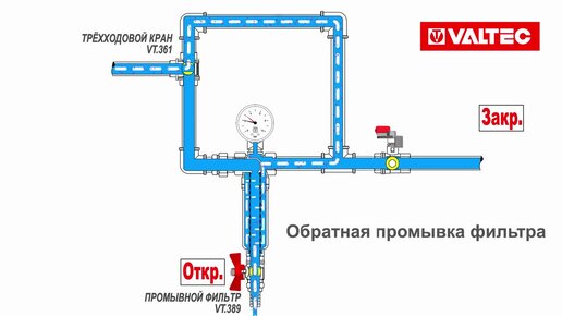 Пример обвязки промывного каскадного фильтра грубой очистки Valtec с применением трехходового клапана