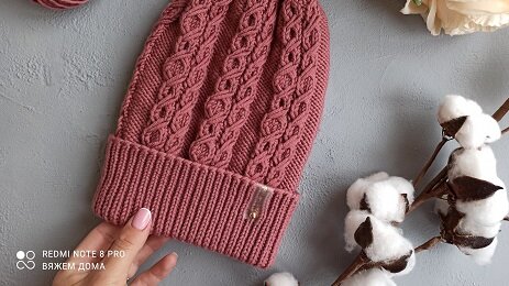 Красивая, теплая, вязаная шапка спицами.
