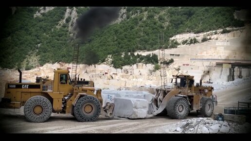 Колесный Погрузчик Caterpillar 988B, загружающий мраморные блоки на грузовые автомобили