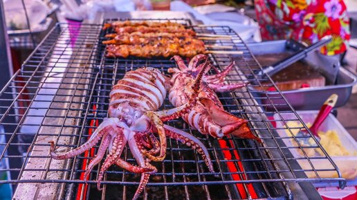 Огромный Кальмар c морепродуктами. Японская уличная ЕДА.