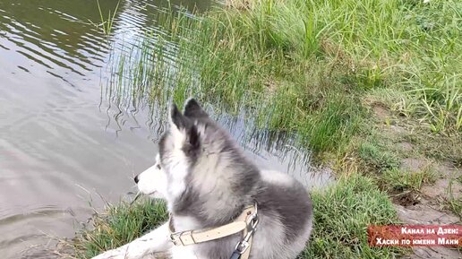 Первая встреча хаски по имени Мани с водоемом (прудом)