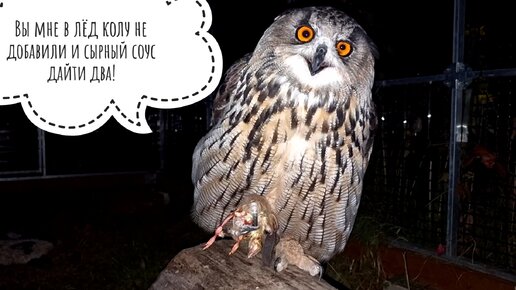 Сова филин Ёль продолжает тренировки меня. Я хорошо приношу вкусное, я молодец!