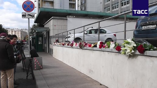 Люди принесли десятки букетов к посольству Великобритании в Москве после сообщения о смерти королевы Елизаветы II
