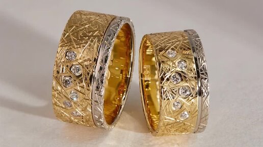 Необычные обручальные кольца с гравировкой и фактурной поверхностью из двухцветного золота и бриллиантами