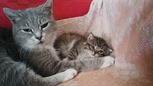 Пополнение в кошачьем семействе. Мама-кошка не даёт баловаться котёнку)))
