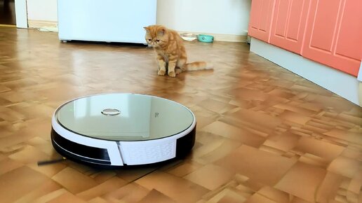 Смешной котёнок Рози впервые встретился с робот-пылесосом.