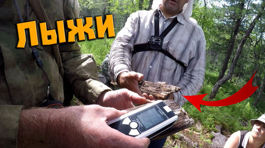 Перевал Дятлова. У кедра показываю лыжи, найденные прошлым летом в ручье ниже настила