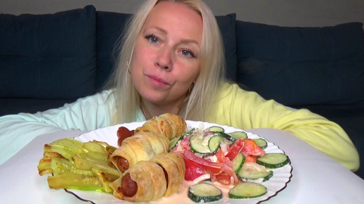 Сосиски в тесте, жареные кабачки, салат овощной. Мукбанг. Еда.