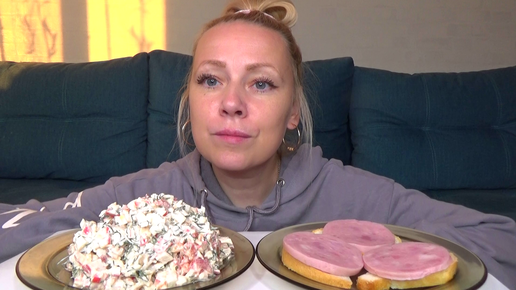 Салат Бриз с крабовым мясом и помидорами. Бутерброды с ветчиной. Еда.