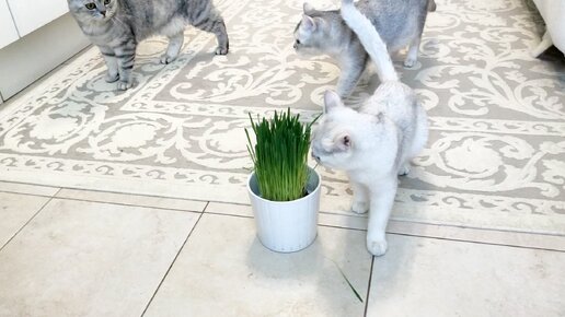 Кот Маню, кошка Кайли и малютка Кристалл едят свежую травку.