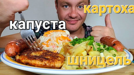 МУКБАНГ. ОБЖОР. КАРТОХА НА САЛЕ, КАПУСТА, ШНИЦЕЛЬ,СОСИСКИ.