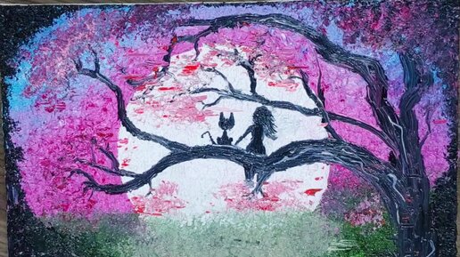 Как нарисовать девушку и кошку смотрящую на луну, сидя на красивом дереве
