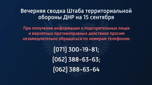 Вечерняя сводка штаба территориальной обороны ДНР на 15 сентября 2022 года