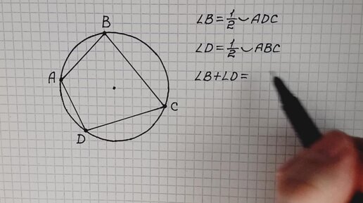 Доказательство того, что сумма противоположных углов вписанного четырёхугольника равна 180⁰.
