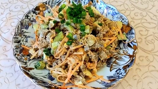 Восхитительный и очень сытный салат из куриной печени с грибами. Займет своё место на столе