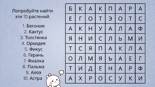 Получится найти 10 растений за полторы минуты? Расслабляющий филворд под спокойную музыку.