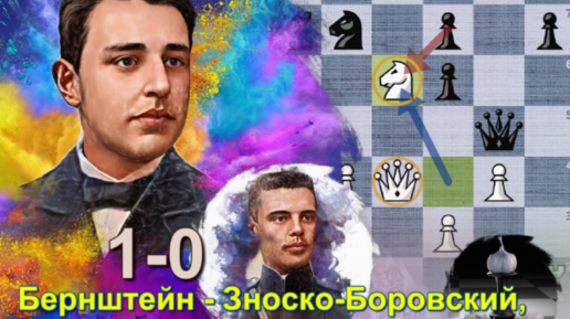 Бернштейн жертвует коня, затем ладью - все для получения выгодной позиции за белых. Зноско-Боровский считает не так далеко (С-П, 1909, 1-0)