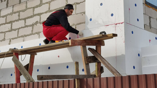 Приклейка пенополистирола ППС16ф на фасады газобетонного дома, приклейка на клей-пену Ceresit CT84, фиксация Бийским Фасадным Дюбелем ДС-2