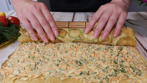 Шикарный рулет из обычных кабачков. Выглядит эффектно, готовится быстро и просто. Гости будут удивлены. Берите на заметку рецепт.