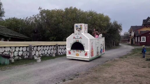 Емеля катает народ на самоходной на печке в Парке Сказов под Екатеринбургом