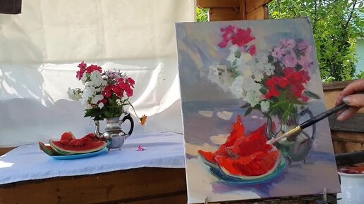 Флоксы и арбуз. Этюд натюрморта на пленэре.