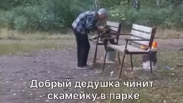 Добрый дедушка чинит скамейку в парке