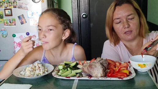 Мукбанг с Вероникой, обед. Отварная баранина, овощная нарезка и салат оливье.