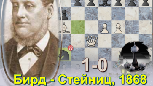 Генри Бирд имеет свой взгляд на шахматную игру: двигает пешки, жертвуя ладью Стейницу - мат в доигрывании "поцелуй смерти" (Лондон, 1868)