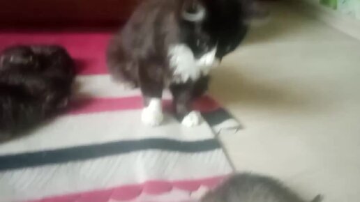 Озорной котенок играет с новорожденными,слепыми котятами.Новорожденные котята.