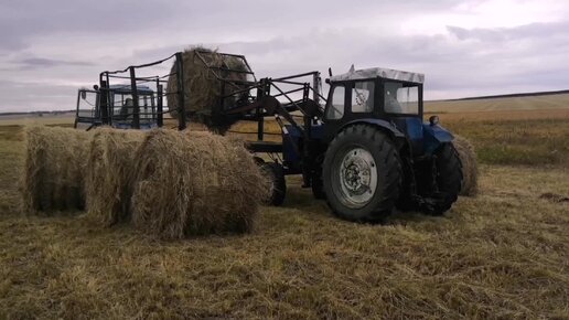 Мтз-50 загружает рулоны сена в тележку